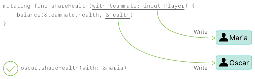 在上面的例子中,调用 Oscar 玩家的shareHealth(with:) 方法分享血条给 Maria 玩家不会造成冲突。在方法调用的过程中只有一个写入访问到oscar 因为oscar 是异变方法中self 值,并且在同一时间内只有一个写入访问到maria 因为maria 是以输入输出形式参数传递的。如下面的图例所示,他们访问了内存中不同的地址。就算他们的写入访问是同时发生的,但不会冲突。