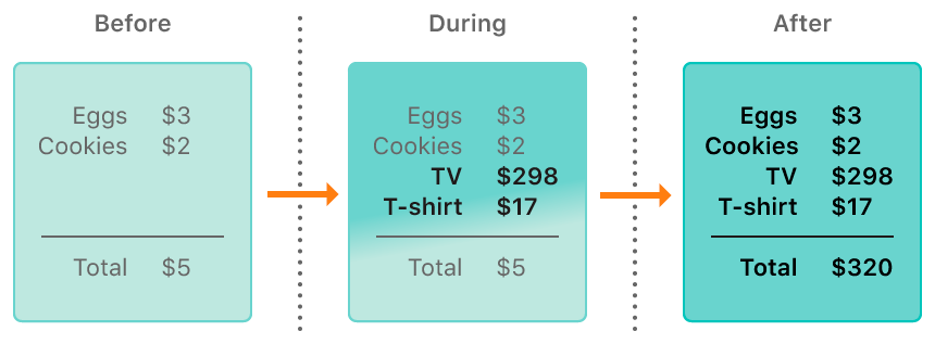 你可以想象一个类似的问题比如你是如何更新一张写在纸上的预算。更新预算是一个两步过程:首先你添加项目的名字和价格,然后你改变总价来显示当前列表中的变化。在更新的前后,你可以读取任何预算信息并且得到正确的结果,图例如下:
